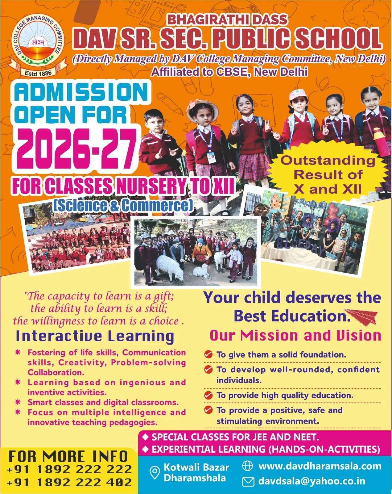 BD DAV SR. SEC. PUBLIC SCHOOL, Brij Lal Road K. B. Dharamshala, Kangra, H.P. - 176215 E-mail : [email protected] Website : davdharamsala.com